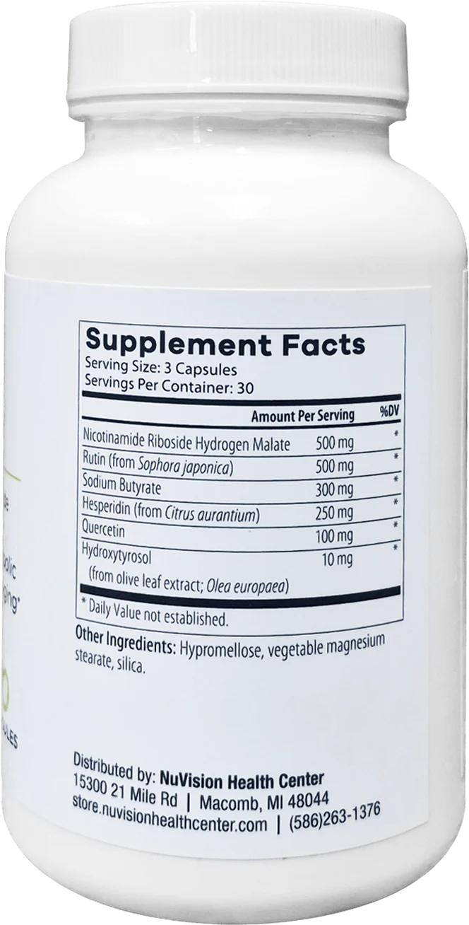 With ingredients like rutin, quercetin, hesperidin, sodium butyrate, and hydroxytyrosol, this next-generation formula supports cardiovascular health, metabolic balance, and oxidative defense—delivering a full-spectrum approach to energy, longevity, and vitality. This synergistic approach ensures better absorption, utilization, and long-term results compared to standalone NAD+ supplements.